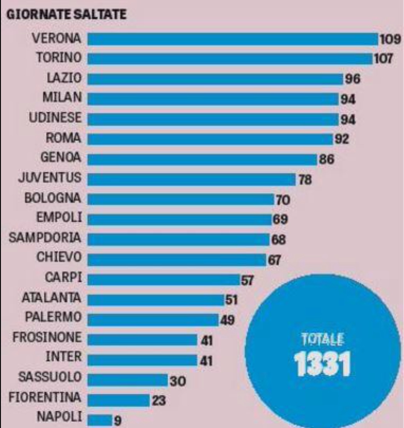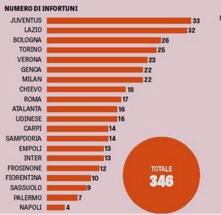 L’edizone di oggi de La Gazzetta dello Sport propone due grafici, legati alla situazione degli infortunati in serie A. Come mostra la rosea, il Napoli ha collezionato solo quattro infortunati in questa stagione, con sole nove giornate saltate da parte degli azzurri colpiti. Un numero estremamente esiguo considerando che, ad esempio, sono 23 le giornate saltate dai giocatori infortunati della Fiorentina, la squadra appena sopra il Napoli in questo grafico. Juventus la peggiore per numero di giocatori passati in infermeria, con ben 33 elementi registrati.