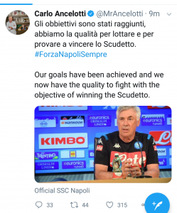 Il tecnico del Napoli Carlo Ancelotti, nell’ imminente vigilia di Fiorentina Napoli ha lanciato un Tweet con il quale ha caricato la squadra e l’intero ambienye azzurro :”Gli obiettivi sono stati raggiunti, abbiamo le qualità per lottare e per provare a vincere lo scudetto.”