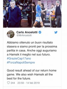 Ancelotti da Twitter: “Buona gara stasera, ad Hamsik auguro il meglio”