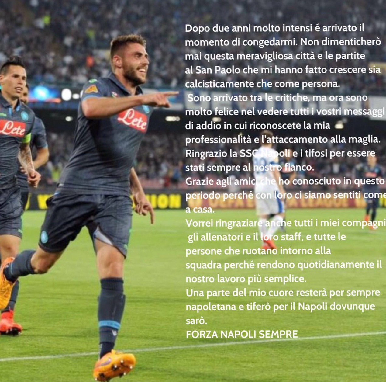 “Dopo due anni molto intensi è arrivato il momento di congedarmi. Non dimenticherò mai questa meravigliosa città e le partite al San Paolo che mi hanno fatto crescere sia calcisticamente che come persona. Sono arrivato tra le critiche, ma ora sono molto felice nel vedere tutti i vostri messaggi d’addio in cui riconoscete la mia professionalità e l’attaccamento alla maglia. Ringrazio la Ssc Napoli e i tifosi per esser stati sempre al nostro fianco. Grazie agli amici che ho conosciuto in questo periodo perchè con loro ci siamo sentiti come a casa. Vorrei ringraziare anche tutti i miei compagni, gli allenatori e i loro staff, e tutte le persone che ruotano intorno alla squadra perchè rendono quotidianamente il nostro lavoro più semplice. Una parte del mio cuore resterà per sempre napoletana e tiferò per il Napoli dovunque sarò. FORZA NAPOLI SEMPRE”.