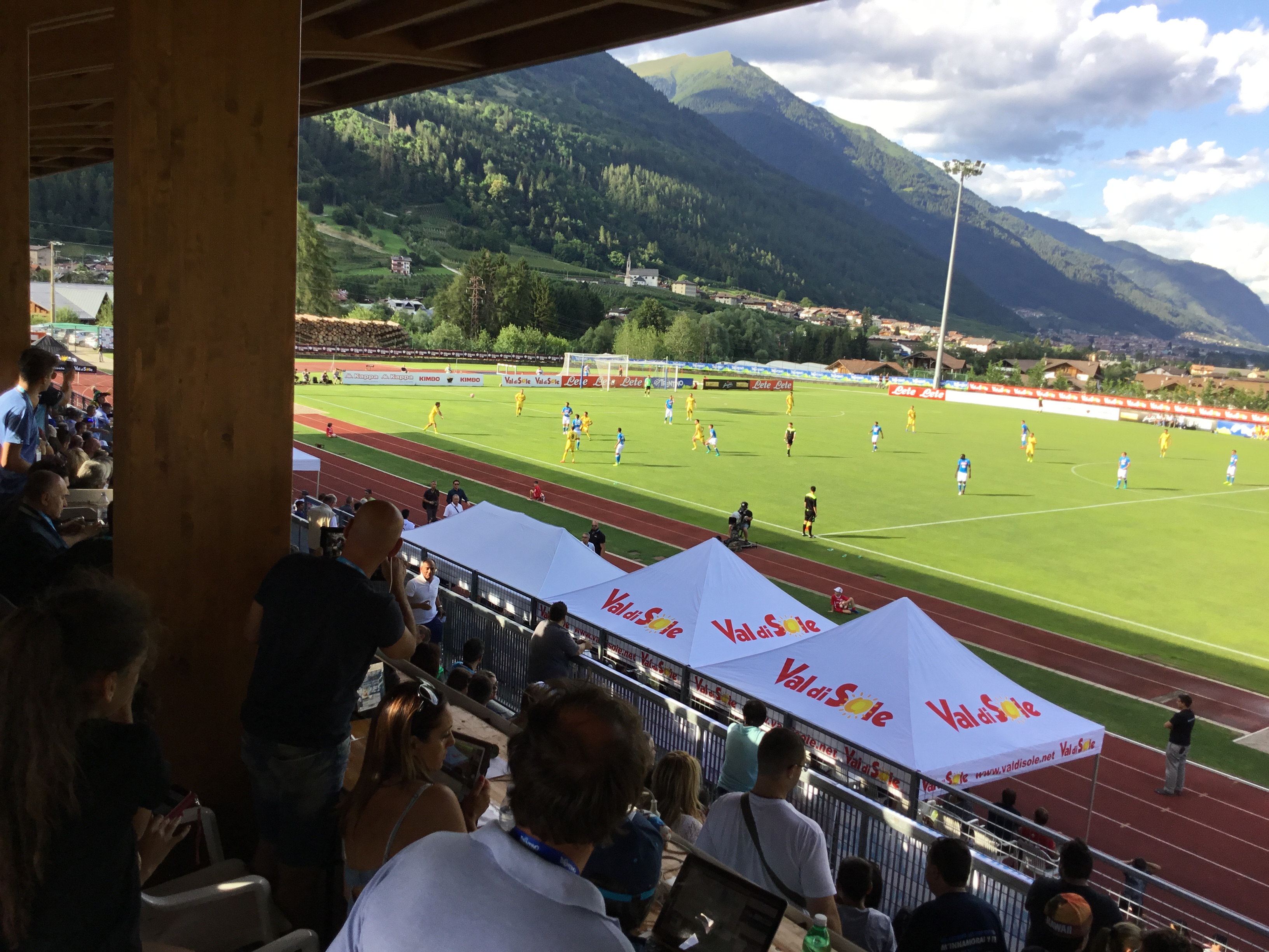 Il presidente del Napoli arrivato al campo di Carciato durante il 20′ del primo tempo della prima amichevole stagionale. Si è accomodato a bordo campo salutando il pubblico che gli ha urlato:”Vogliamo vincere”.