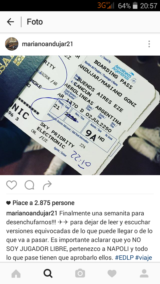 Qualche giorno fa dall’Argentina è rimbalzata una voce secondo la quale l’Estudiantes La Plata sarebbe stato intenzionato a presentare un’offerta al Napoli per acquisire l’intero cartellino di Mariano Andújar, tornato in azzurro dopo il prestito ai Pinchas. La stessa voce diceva anche che, in attesa di conoscere il suo futuro, l’ex portiere catanese sarebbe andato in vacanza a Cancun. E infatti, dal suo profilo Instagram, l’estremo difensore ha pubblicato la foto del biglietto d’aereo per il Messico, accompagnandolo con un messaggio che rivela molto circa le sue intenzioni future: “Finalmente una settimana per staccare la spina e per finirla di leggere versioni sbagliate di ciò che può capitare o succedere. È importante chiarire che io NON SONO UN GIOCATORE LIBERO, appartengo al Napoli e qualunque cosa accada devono approvarla loro“. Più chiaro di così…
