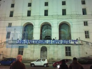 Caldissimo il clima in casa Napoli, in vista del match di giovedì sera contro l’Arsenal. Uno striscione è stato apposto dalla Curva B in piazza Carlo III, nel cuore della città, con un chiaro messaggio in vista della sfida di ritorno: “18-04-2019, pretendiamo la Coppa Uefa!”.