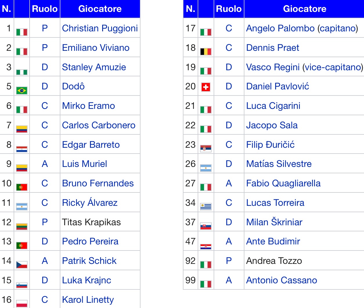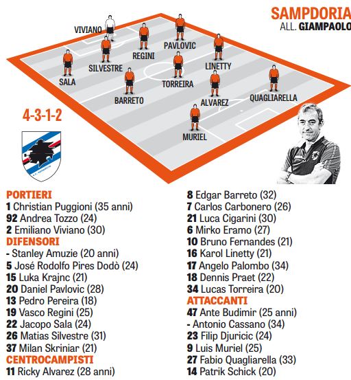 PUNTI FORTI: L’esperienza di Quagliarella e l’estro di Muriel possono essere insidiosi per la difesa Napoletana, che dovrà fare a meno di qualche uomo.