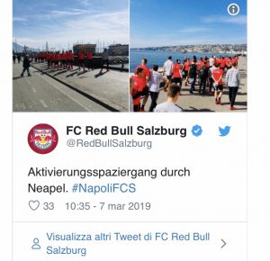 Inizia sul lungomare l’allenamento del Salisburgo in vista della gara di questa sera. I calciatori del club austriaco, che alloggiano in un albergo su via Partenope, stanno effettuando in questi minuti la parte iniziale dell’allenamento correndo sul lungomare.