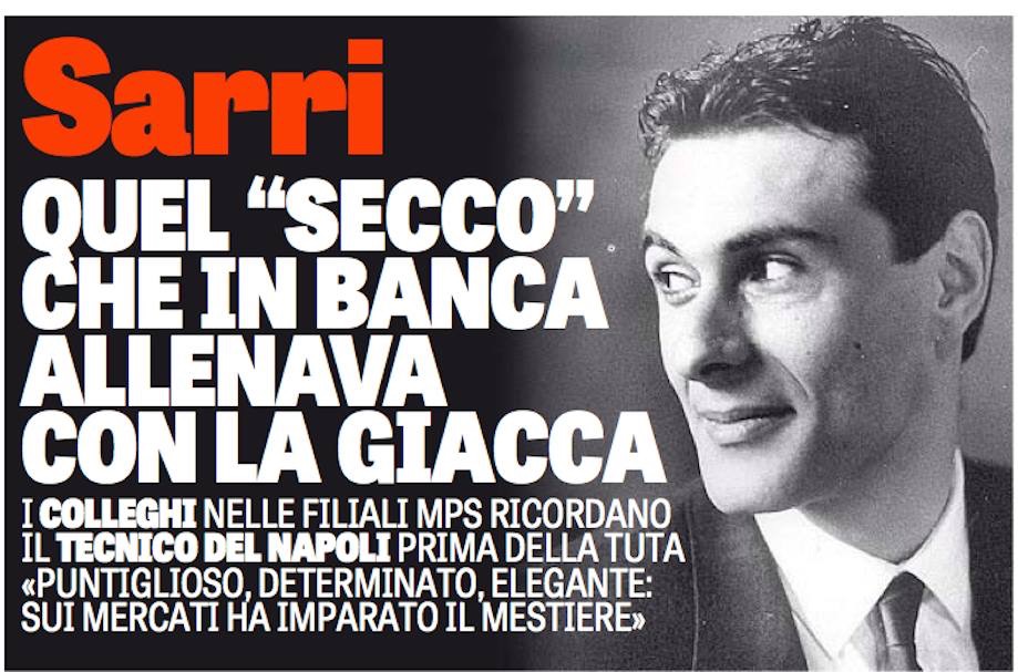 La Gazzetta dedica una pagina a Maurizio Sarri, al suo passato di bancario. Filippo Conticello intervista gli ex colleghi in Monte Paschi. “Era il leader dello spogliatoio anche da noi. Sui mercati finanziari decidi in un secondo, devi essere freddo e razionale: se ti si infortuna un giocatore è uguale, serve subito la soluzione”, dice il suo storico compagno di banco. Un’altra collega ricorda che cominciarono insieme il 7 gennaio 1980: «Ha scommesso su se stesso e ha vinto meritatamente». Altri invece ricordano il suo look tutt’altro che trasandato. “Un tipo elegantissimo: Galliani dovrà? mangiarsi le mani due volte se non l’ha preso perche? pensava non fosse cool». Scavando a fondo nel look, invece, il ritratto si fa noir: «Cappotto nero, camicia nera, giacca nera: un tenebroso che piaceva molto alle donne»”. Per tutti era il Secco. E i colleghi ricordano divertiti di quando era impegnato a fare gli schemi per le partite della domenica.