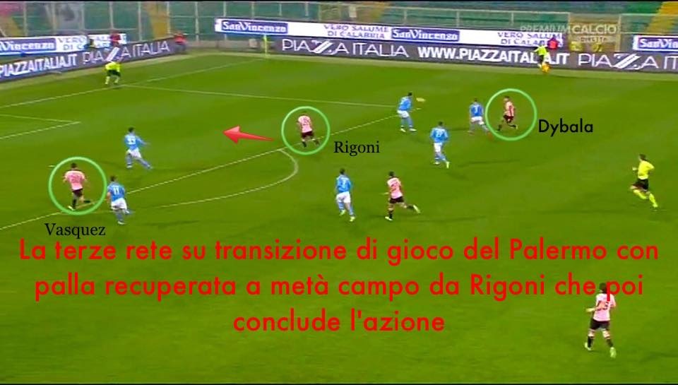 Nel fotogramma postato analizziamo la terza rete subita dagli azzurri,che deriva da un errata giocata nell’impostazione di Jorginho,con Rigoni che recupera palla,scaricando su Dybala che salta Strinic creando il due contro due. Albiol cerca di coprire sul cambio di gioco su Vasquez ma è in netto ritardo e sull’appoggio dell’argentino Rigoni che aveva avviato l’azione di gioco firma il tap in vincente,senza la necessaria copertura di un centrocampista.