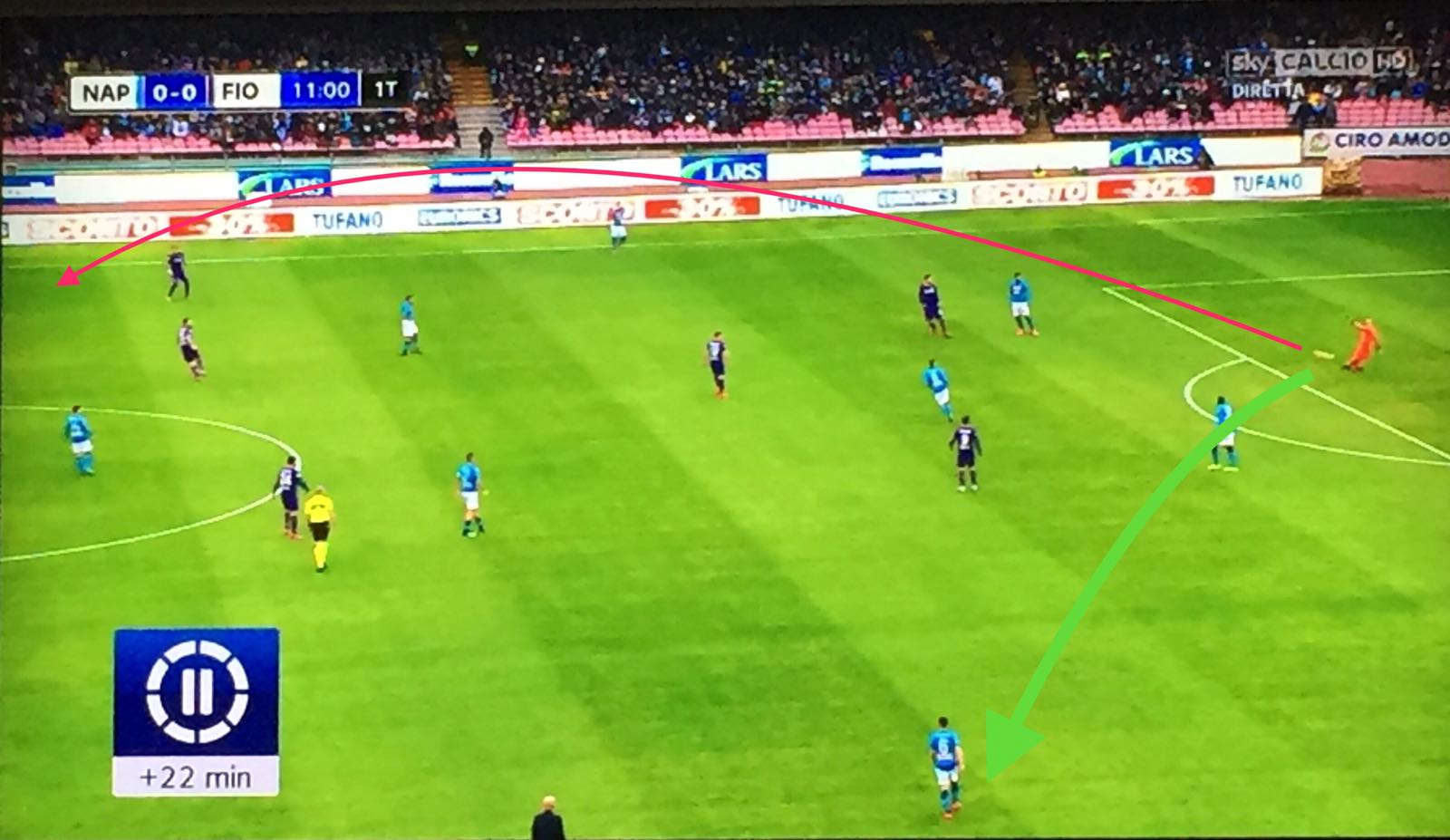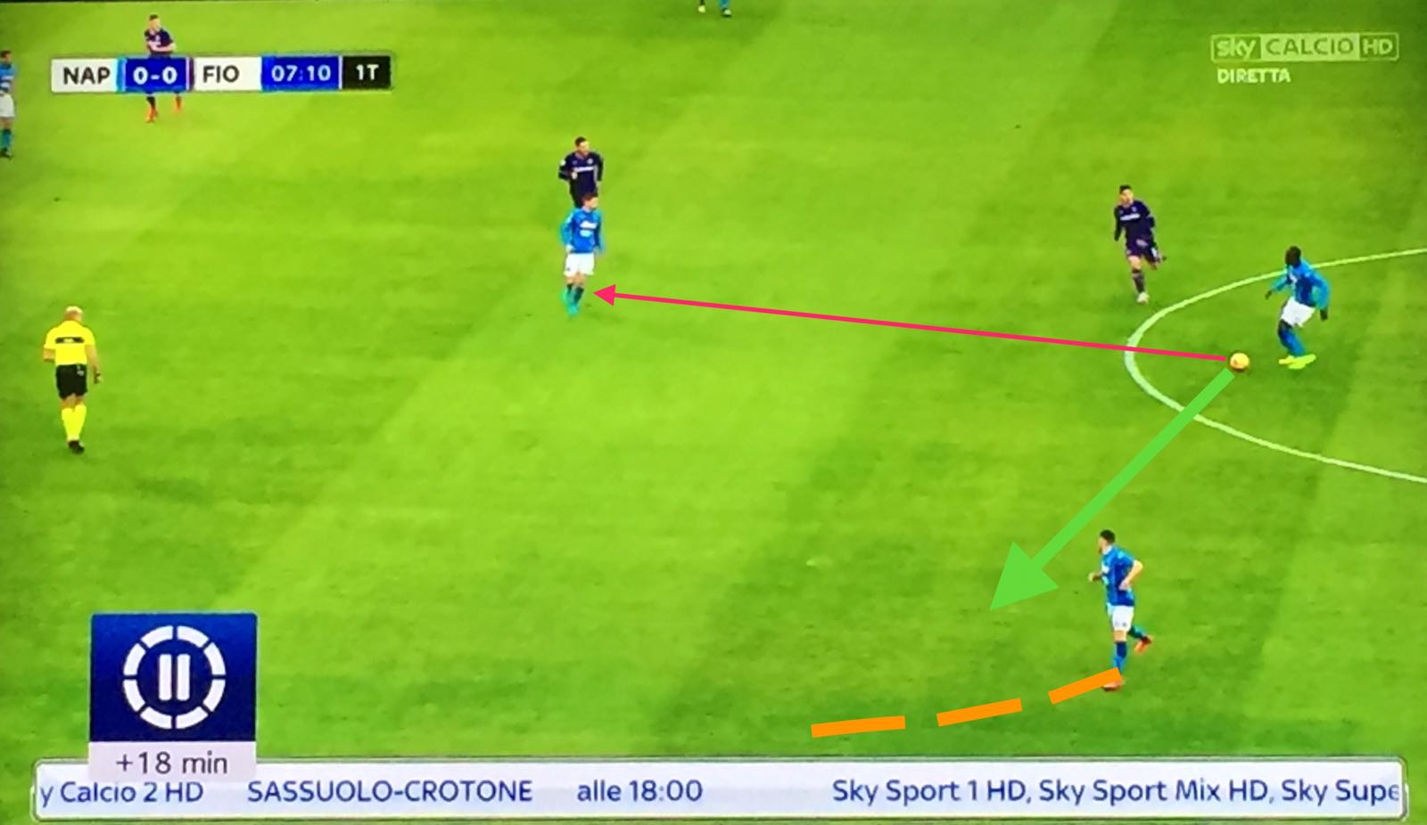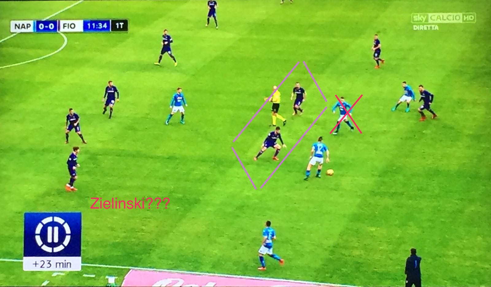Non lo aiuta nemmeno l’assenza di Insigne: Zielinski non è la stessa cosa. Il polacco parte troppo centralmente, andando così a lasciarsi imbottigliare dalle maglie viola.