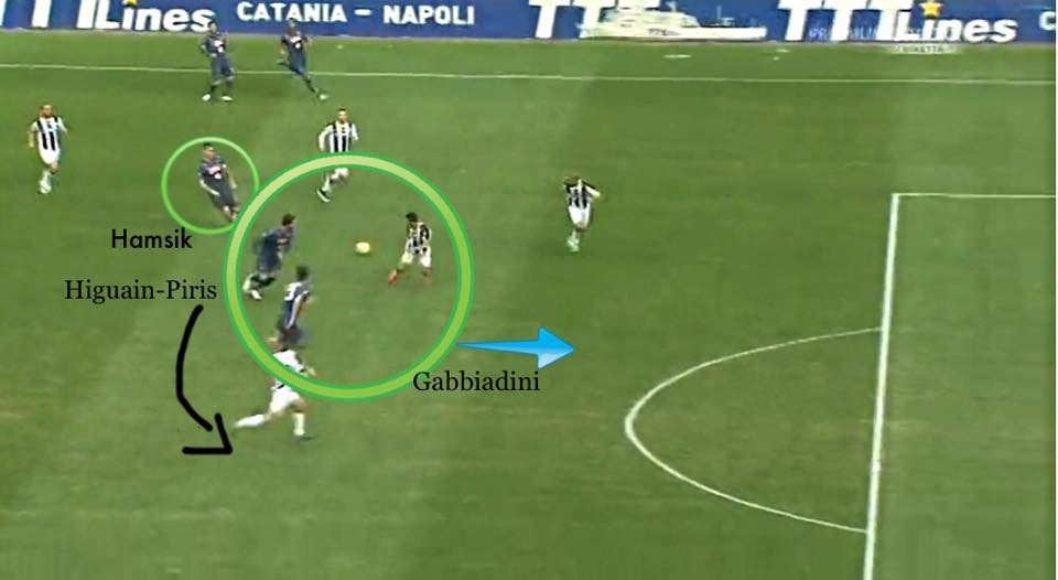 Andiamo ad analizzare la situazione di gioco dove gli azzurri raddoppiano. Doppio scambio di gioco su zona laterale mancina tra Mertens-Hamsik che con il conta giri serve Gabbiadini che attacca lo spazio centrale della difesa a 3 friulana lasciato da Piris che viene ingannato da Higuian che effettua un contro movimento a mezza luna,siglando il 2-0.L’esterno bergamasco fin ora ha dimostrato la stessa efficacia di Callejon su quella zona di campo,ma il suo modo di attaccare la linea difensiva avversaria è diversa dallo spagnolo.Gabbiadini quando l’azione di gioco si sviluppa sul lato opposto attacca centralmente,Callejon invece preferisce attaccare alle spalle del laterale basso,ma l’efficacia non cambia.