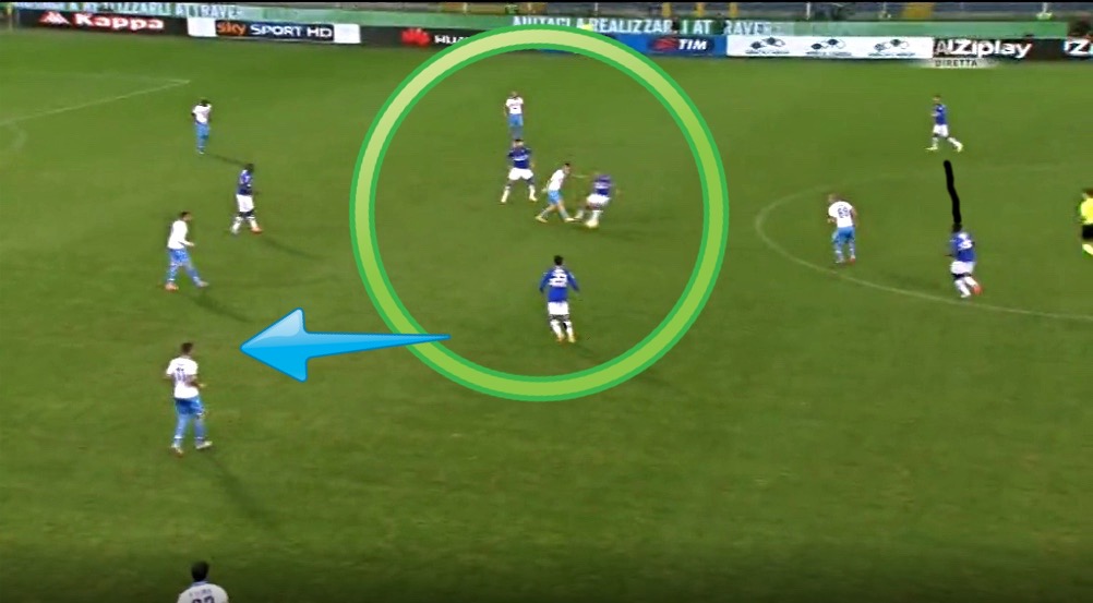 Nel fotogramma postato si nota come Hamsik si abbassi in mezzo al campo,cercando l’uscita con un uno/due con Inler che non riesce vista la pressione di Obiang. Solo quando è calato il ritmo da parte dei doriani,è uscita fuori la qualità superiore degli azzurri,nonostante l’inferiorità numerica. Da manuale l’azione sull’asse mancino Mertens-Ghuolam con Zapata pronto in area con la zuccata vincente.