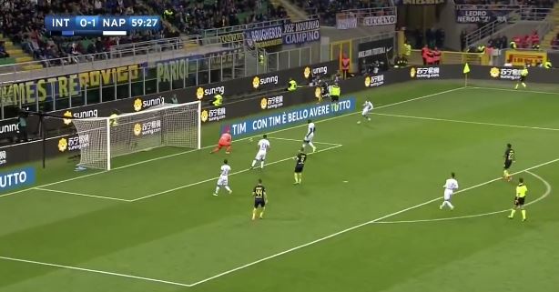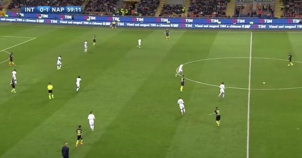 Candreva arretra per giocare la palla con i centrocampisti, ma costringe Insigne a schierarsi come quarto di sinistra. D’Ambrosio prova ad inserirsi alle sue spalle, ma la palla di Brozovic è leggermente lunga e costringe il terzino dell’Inter a rincorrere la sfera.