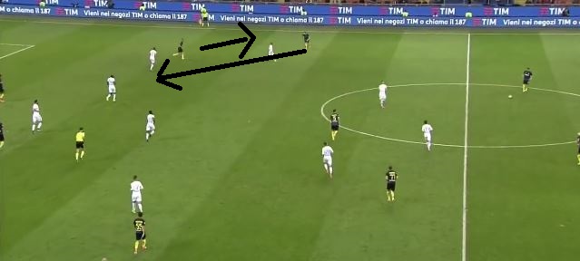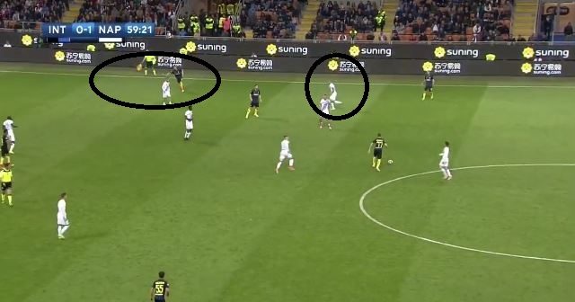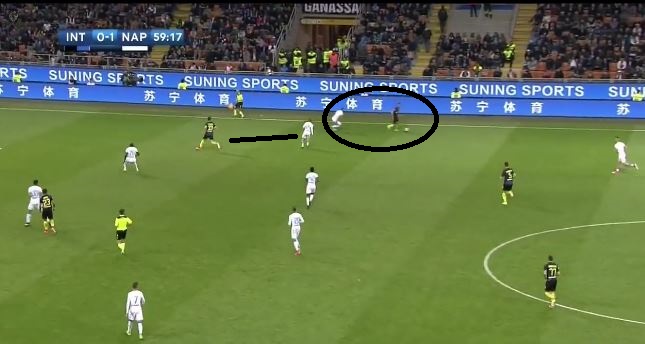 Durante il match contro l’Inter Lorenzo Insigne si è lamentato a più riprese con il proprio allenatore per il suo sforzo notevole anche in zona difensiva a causa della presenza di Ghoulam che non si preoccupa tanto della linea. Come si può vedere nei fotogrammi successivi è avvenuto proprio questo: Insigne ha dovuto lavorare in diverse occasioni come vero terzino perché l’algerino del Napoli seguiva troppo Candreva e l’inserimento successivo di D’Ambrosio portava il talento di Frattamaggiore a seguire ad uomo il terzino destro dell’Inter. In questo caso è sufficiente uno scambio di marcatura con Insigne che va in pressione su Candreva e Ghoulam che resta in linea difensiva per interessarsi della possibile discesa del terzino avversario. In questo modo il numero 24 del Napoli è stato costretto a percorrere tanti km sulla fascia sinistra.