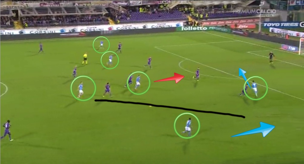 Firenze, Risultato giusto, anche stretto per gli azzurri che soffrono come normale che sia solo negli ultimi dieci minuti finali. Squadra sempre compatta, stretta, raccolta in pochi metri nelle tre linee di gioco. Lavoro importante fondamentale è stato fatto dai centrocampisti,con Jorginho e Lopez con l’aiuto a supporto alternato di Hamsik su Aquilani e col rientro dei due esterni, non hanno lasciato modo di effettuare il consueto possesso palla alla squadra di Montella, suo marchio di fabbrica. Altra mossa vincente è stata la scelta di lasciar far gioco a Savic,e non a Gonzalo Rodriguez,con Higuain che oltre a giocate di alta classe, riesce anche ed effettuare un lavoro oscuro. Nella ripresa Montella passa al 3-5-2, voleva infatti superiorità in mediana visto il grande pressing del Napoli, inserendo anche Pizarro,ma il lavoro fatto dai centrocampisti azzurro è stato impressionante,sempre in partita,senza nessun errore in entrambe le fasi di gioco.