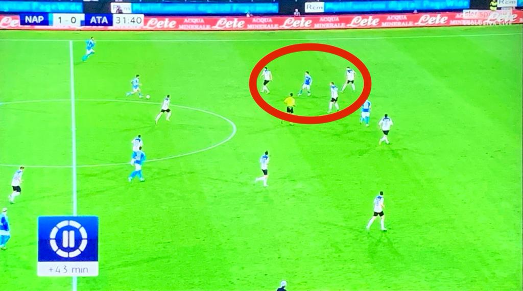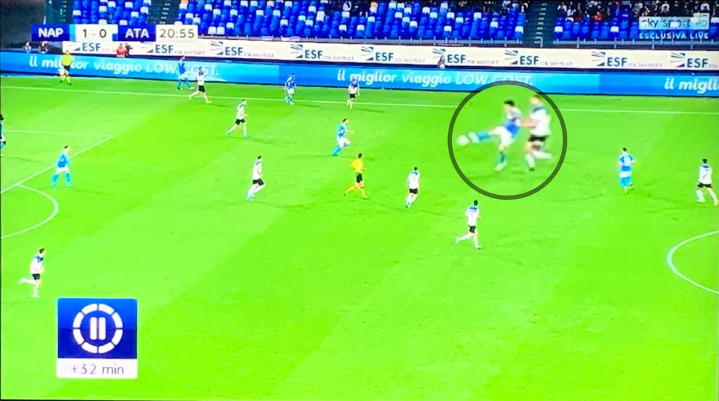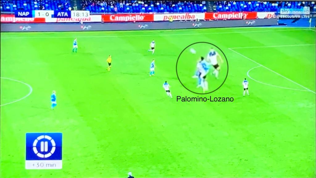 Anche fisicamente, nonostante non si direbbe per la statura ed il passo da brevilineo, Lozano riesce a reggere l’urto coi difensori dell’Atalanta, nella fattispecie Palomino. Che prova ad anticiparlo di testa, facendo prevalere la maggiore prestanza atletica, ma si deve arrendere all’elevazione del messicano che sorprendentemente riesce ad aggiudicarsi una palla contesa e sulla quale solitamente un attaccante di pochi centimetri non si avventa nemmeno. Era una palla aerea, vagante, una delle tante che con Ancelotti si vedono spazzate verticalmente dalla retroguardia ma che se dosate lentamente diventano delle comodissime prede: tuttavia il coraggio e la volontà di Lozano hanno avuto la meglio nella capacità di destreggiarsi quando veniva braccato da dietro. E l’Atalanta è un osso durissimo da questo punto di vista: squadra molto maschia, amante dei placcaggi, anche quelli più rischiosi e che in teoria costerebbero una (massima) punizione.
