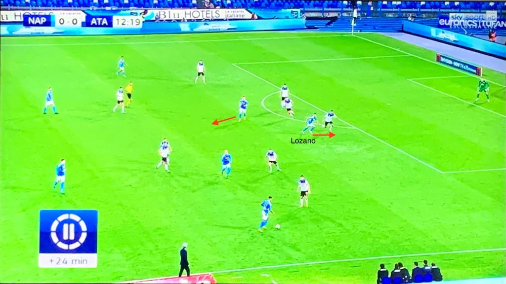 Ancelotti non cambia idea tanto facilmente, per cui se pensa che Lozano possa essere uno dei due attaccanti centrali, allora è difficile che lo rivedremo in un’altra posizione, a meno che non sia il messicano – come nel caso di Insigne – a manifestare in maniera più o meno esplicita la volontà di cambiare. Torino a parte, infatti già Ferrara al posto di Callejon lasciato a riposo gli preferì Elmas, mai Lozano è partito largo a destra come ai tempi del PSV. Ricostruendo un po’ la vicenda, Lozano viene acquistato dal Napoli, con il benestare di Carlo Ancelotti che per primo lo aveva segnalato dopo il Mondiale in Russia, con la ferma intenzione di utilizzarlo da co-centravanti: in effetti De Laurentiis non avrebbe speso una cifra vicina ai 38 milioni di euro per un esterno; uno sforzo lo aveva fatto qualche anno fa solamente per Higuain, e parliamo per l’appunto di un numero nove, ossia di uno per il quale, secondo il De Laurentiis pensiero, debba valere veramente la pena. E in un certo tipo di partite, quando la linea di difesa avversaria è particolarmente ardita e concede campo alle spalle, Lozano dà una mano in profondità mentre l’altra punta – in questo caso Milik – fa finta di venire in contro per ricevere il suggerimento di Di Lorenzo. Con questo movimento ad entrare in area di rigore, Lozano porta via un difensore orobico che lo segue passo dopo passo come da protocollo ‘gasperiniano’ lasciando eventualmente un corridoio nel mezzo utile per essere attaccato successivamente da un uomo a rimorchio o dallo stesso Milik. I presupposti ci sono, sono interessanti: Lozano legge il gioco correttamente. Gli manca poi quel guizzo finale di follia per trasformare una potenzialità in concretezza.