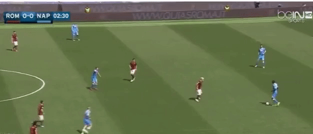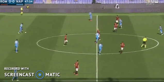 Nella ripresa il Napoli cerca di sorprendere la Roma con l’accentramento di Mertens sulla zona trequarti (seguito ad uomo da Maicon che lascia un buco sulla destra) e il successivo scambio di posizione con Hamsik. In questa situazione il capitano azzurro, liberatosi sulla sinistra, prova un tiro che viene deviato da Rudiger.