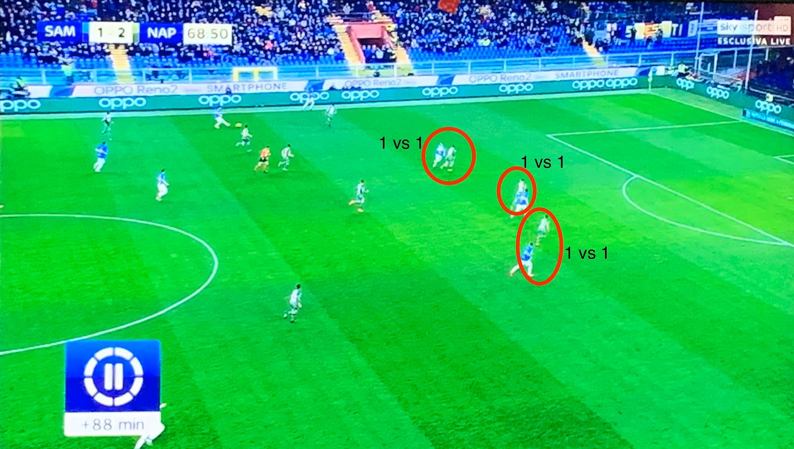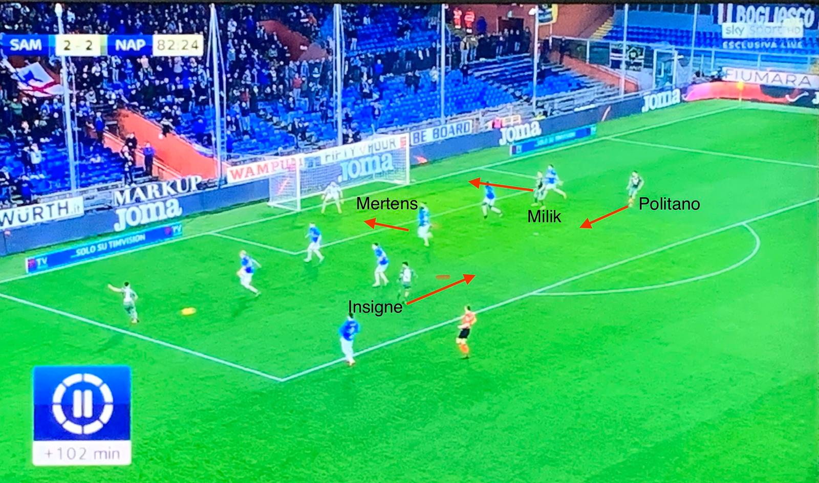 Il Napoli ha vinto una partita che l’ha sottoposto ad interpretare più partite in una, frazionata in diversi fasi di gioco piuttosto singolari. Ha certificato soprattutto la crescita di questa squadra ed il lavoro di Gattuso, nonostante le difficoltà incontrate. Il Napoli riprende a giocare un calcio spettacolare, da un lato, e a reagire a momenti di black out, dall’altro: è maturo per tornare ad occupare posizioni di classifica ben più importanti. Primi venti minuti sulla scia della sfida con la Juventus: palleggio e supremazia territoriale di grande livello, che la qualità dei giocatori del Napoli evidentemente superiore a quelli della Samp ha accentuato contro un avversario che Ranieri ha messo in campo in maniera molto prudente, forse fin troppo se parametrata alle bocche di fuoco di cui dispone in avanti. Ma l’identità delle squadre di Ranieri è chiara, è votata a pensare prima a non prenderle. Ed il Napoli, che sta recuperando spiccate dote offensive, ha trovato terreno fertile per indirizzare immediatamente il match sui binari ideali alle proprie caratteristiche. Quando, di contro, a causa di un episodio – il gol di Quagliarella: un’azione estemporanea – la gara ha cominciato a sporcarsi. Un aspetto evidenziato lucidamente dal vice di Gattuso, Luigi Riccio, intervenuto nel post partita: la nuova guida tecnica degli azzurri ha già preso atto della natura della squadra, che ha bisogno di giocare la palla, dominare, controllare; se comincia a subire fisicamente gli avversari, che la mettono sul piano del temperamento e delle circostanze occasioni – come la prodezza di un attaccante o qualche pallone lanciato verso le punte -, il Napoli perde ritmo, arretra il baricentro, di fatto annulla la propria pericolosità e rischia di dilapidare un doppio vantaggio meritato come stava per accadere al Marassi. Dopo il momentaneo 1-2 di Quagliarella, Milik ha avuto la possibilità di fare doppietta e richiudere i conti: come spesso accade nel calcio, quando non ammazzi la partita, gli avversari riprendono coraggio e incoraggiati dal pubblico cominciano a produrre il massimo sforzo possibile. La ripresa è stata praticamente di marca blucerchiata, almeno per due-terzi: Il Napoli subisce tre gol – uno è stato annullato – in mezz’ora, un dato che non può passare inosservato. Dimostra una fragilità mentale ed in generale una scarsa capacità di saper tenere botta e limitare i danni. Il Napoli ha dovuto attendere il calo degli avversari, nei dieci minuti finali, per riprendere fiducia, riorganizzarsi e sfruttare le energie fresche dei subentrati. Emblematico il gol di Demme: puntuale l’italo-tedesco ad accompagnare l’azione e battere a rete quasi da trequartista, nonostante in quel momento il Napoli si fosse schierato 4-2-4 e proprio l’ex Lipsia era stato richiamato dalla panchina per cercare di mettere ordine in mezzo al campo. Una mano gliel’ha data involontariamente una scelta infelice di Ranieri, che sostituisce uno dei giocatori che maggiormente stava infastidendo la linea difensiva ospite: Gaston Ramirez, che in una posizione ibrida tra il centrocampo (l’esterno) e l’attacco, rappresentava una continua spina nel fianco per i due centrali. Per preservarlo da una eventuale espulsione – Ramirez, già ammonito, considerato a rischio -, Ranieri rinuncia di fatto, insieme alla sostituzione forzata di Quagliarella – infortunato in occasione del calcio di rigore procurato – a quella pressione che ad un certo non permetteva più al Napoli di uscire con pulizia da dietro.