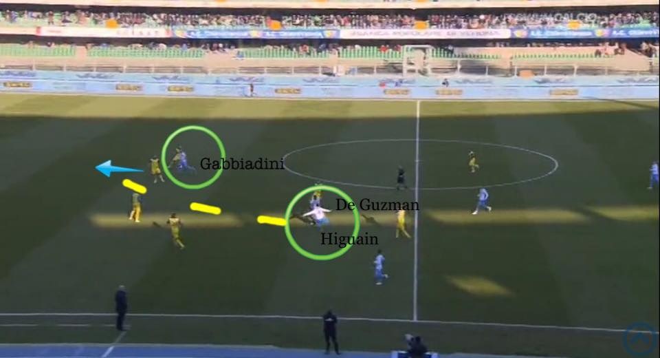 Sempre protagonista vediamo Higuain che si tira fuori dalla linea difensiva veronese ricevendo una sponda di De Guzman e di prima intenzione con un gesto tecnico di assoluta classe innesca Gabbiadini che effettua un taglio da classica punta esterna tra il centrale difensivo e l’esterno basso della difesa del Chievo,con tempi e sincronismi perfetti.
