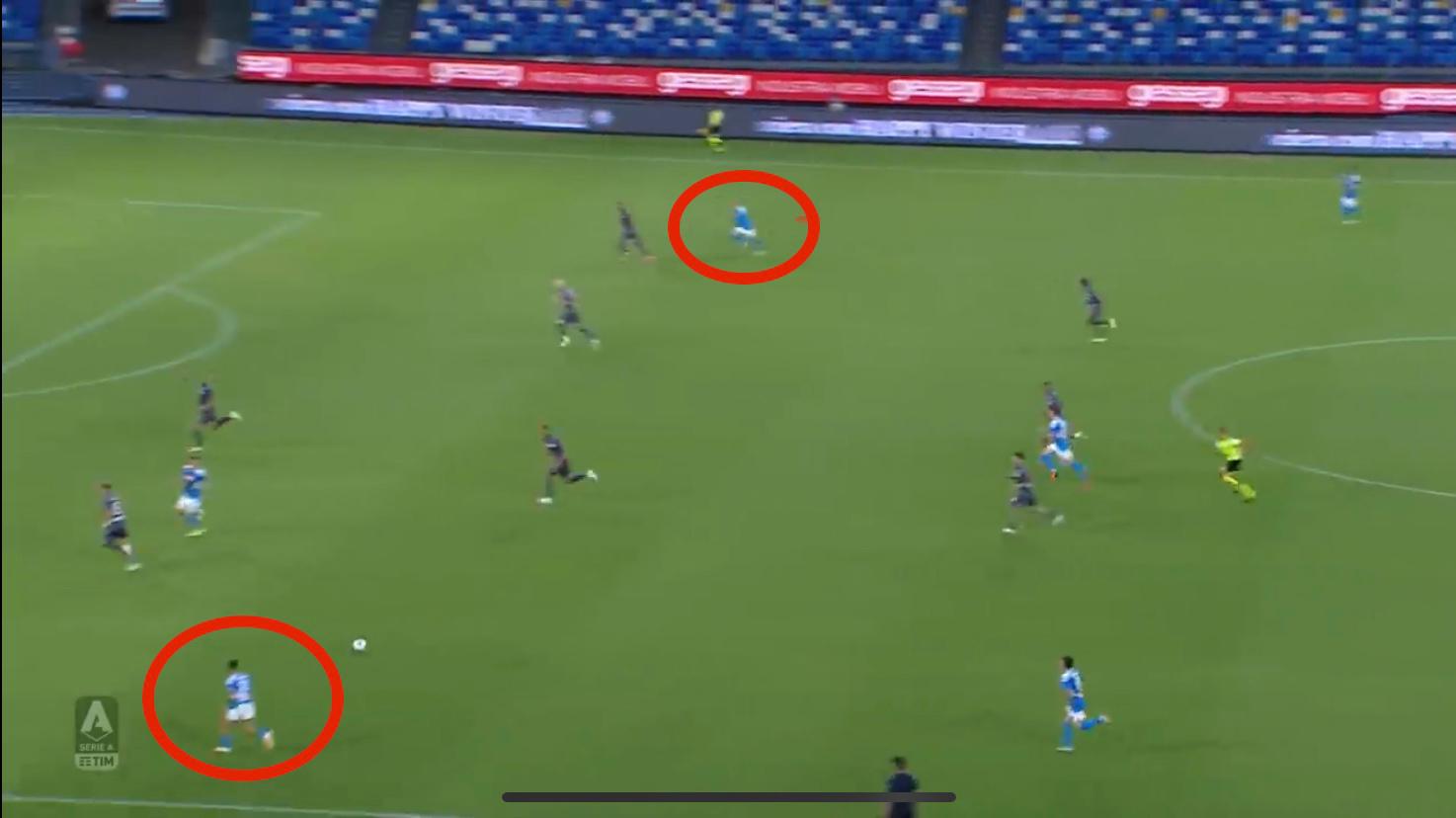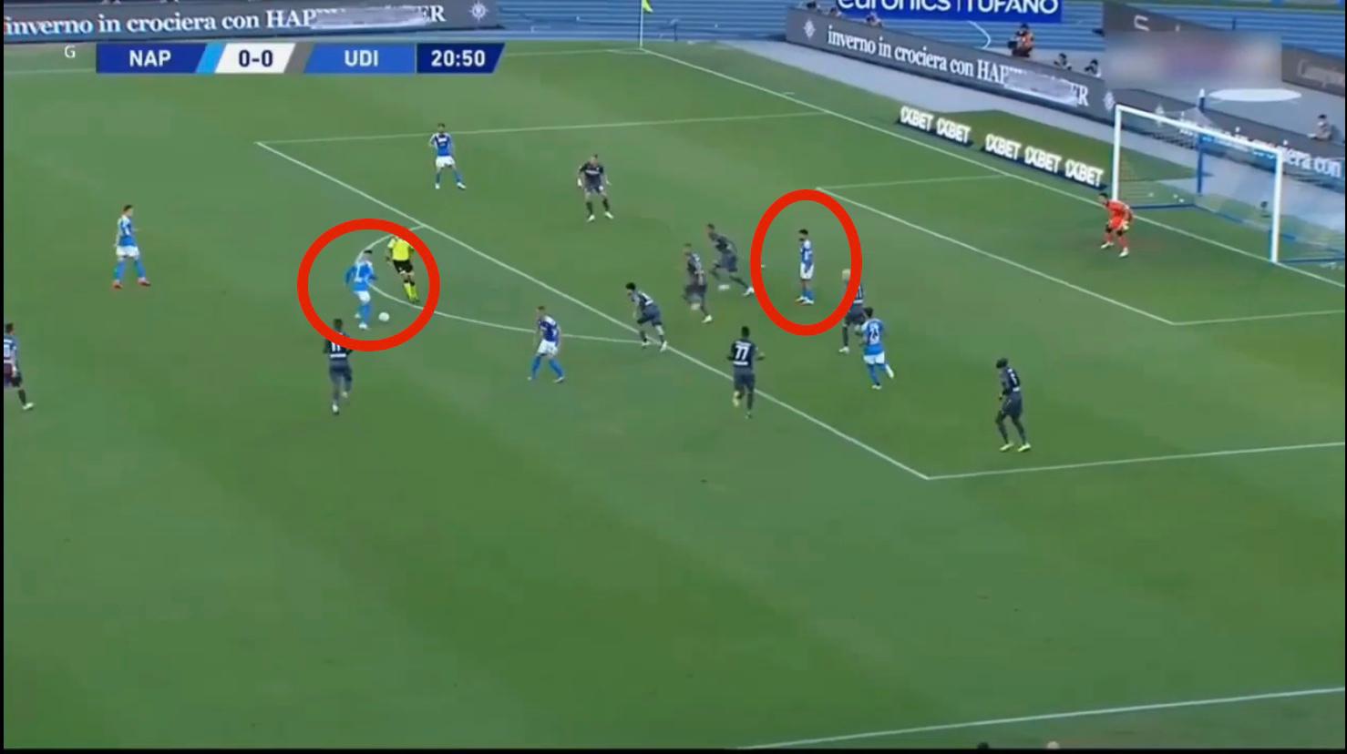 De Paul sbuca “al buio” ed infila su un cross che attraversa tutta l’area di rigore, da un versante all’altro: il Napoli ha già preso, di recente (Milan, Theo), un gol simile per sviluppo ma dalla dinamica opposta. Se ci fate caso, tutti guardano la palla e nessuno si occupa del lato debole, dove appunto sopraggiungerà l’accorrente De Paul: esattamente come Theo, l’argentino è liberissimo (nella fattispecie ancora fuori inquadratura) di battere a rete indisturbato. Di chi era De Paul (si chiede in questi casi)? Come al solito se ne potrebbe discutere per ore: potrebbe essere tanto di Insigne, che al pari di Callejon contro il Diavolo ripiega in ritardo sull’esterno di sua competenza; tanto di Zielinski che, essendo un centrocampista, in teoria dovrebbe avere più attitudini a difendere rispetto ad un attaccante, e capacità di prevedere, oltre che scampare eventualmente, un possibile pericolo che un uomo meno abituato a certe situazioni – e zone di campo – potrebbe anche rischiare di sottovalutare o leggere una frazione di secondo dopo. Tuttavia, ci sarebbe anche da aggiungere che la difesa è costretta tutta a scalare verso l’autore del cross, Zeegelaar, in seguito ad un tentativo di primo pressing abbozzato solamente da Hysaj ed eluso dal giro palla friulano; ragion per cui l’albanese perde contatto con l’esterno olandese, di sua competenza in questo caso, e di conseguenza gli altri difensori mollano le loro posizioni originarie: Koulibaly prova infatti ad accorciare proprio su Zeegelaar, quantomeno per tentare di ostacolarne il passaggio al centro, e Mario Rui stringe correttamente in mezzo all’area per marcare Lasagna; nel frattempo si crea un buco nella parte ‘alta’.