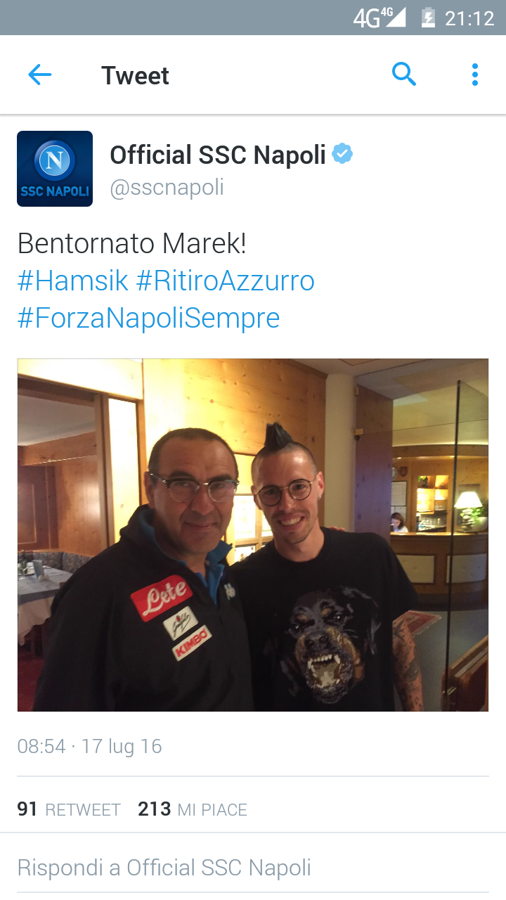 Chiunque andrebbe via da Napoli. Ma lui, Marek Hamsik, no. Fedele nei secoli, contro tutto e tutti, all’azzurro. Poco fa il profilo Twitter dei partenopei ha pubblicato la foto ritraente Marek insieme a Maurizio Sarri. Lo slovacco è qui, pronto per una nuova avventura all’ombra del Vesuvio.