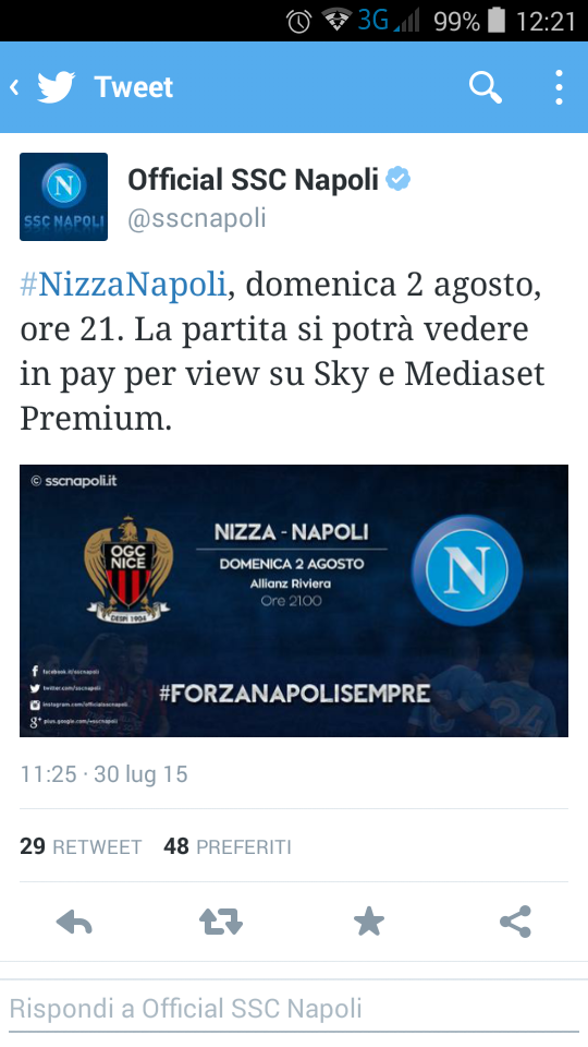 Con un messaggio pubblicato sul proprio profilo ufficiale Twitter, la SSC Napoli ha annunciato che l’amichevole tra gli azzurri e il Nizza, prevista per il 2 agosto all’Allianz Riviera, sarà trasmessa sia da Sky che da Mediaset Premium.