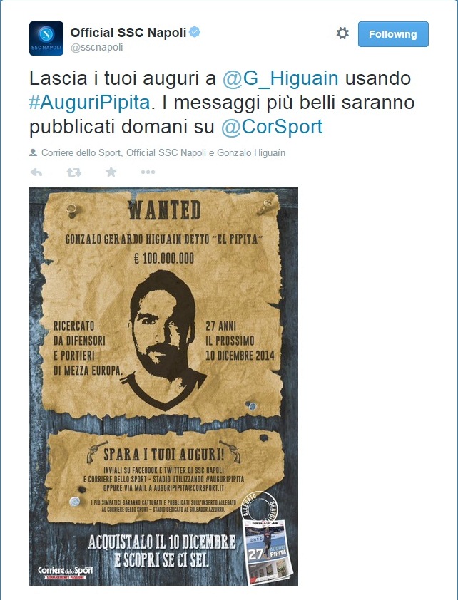 Sul profilo Twitter della @sscnapoli iniziativa in collaborazione con il Corriere dello Sport in occasione del compleanno di Gonzalo Higuain di domani 10 Dicembre. I tifosi possono lasciare i loro auguri per il Pipita e domani vedranno i più belli pubblicati domani sul Corriere dello Sport in una pagina speciale.