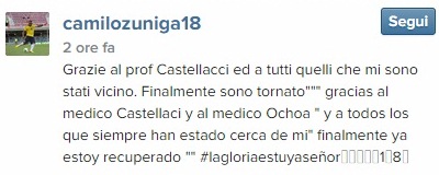 Si avvicina il rientro di Camillo Zuniga che sul suo profilo ufficiale instagram @camillozuniga18 esprime tutta la sua gioia e ringraziamento al Prof.Castellacci.